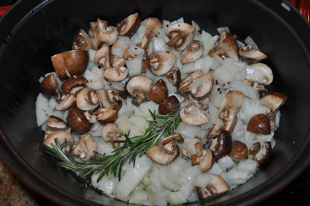 - Puode (ant viryklės, ne orkaitėje) virš didesnės nei vidutiniškos liepsnos įkaitiname aliejų (arba kitus taukus). Apkepiname grybus su svogūnais. Prideame česnako skilteles (aš jų nepjaustau). Beriame cukraus. Vartydami kepiname tol, kol svogūnai šiek tiek karamelizuosis, t.y. gražiai paruduos išorėje, o viduje liks traškūs ir balti. Jeigu puodo dugne yra iš daržovių išsiskyrusių sulčių, reikia pakepinti ilgiau, kol skystis išgaruos ir liks tik riebalai.